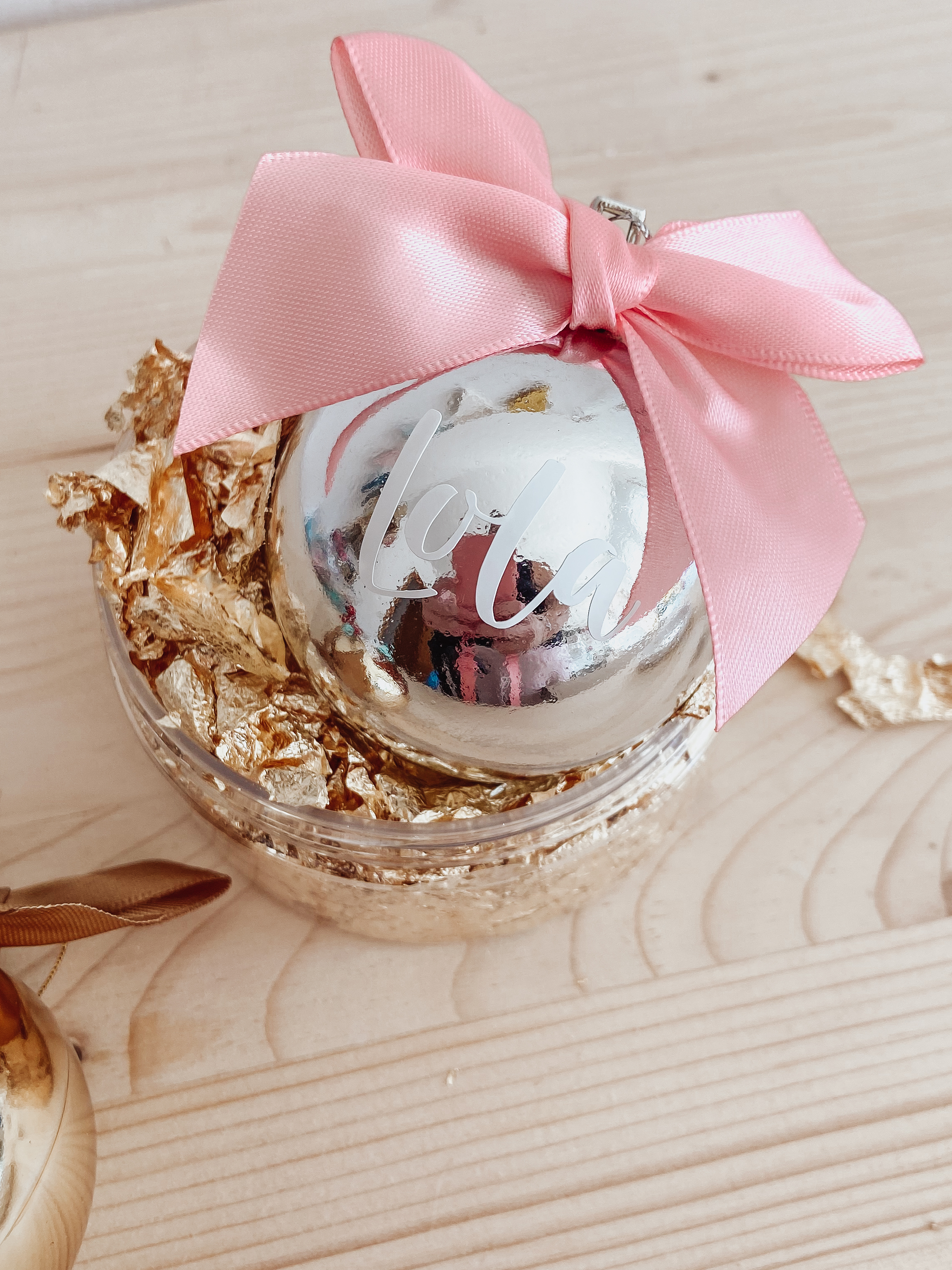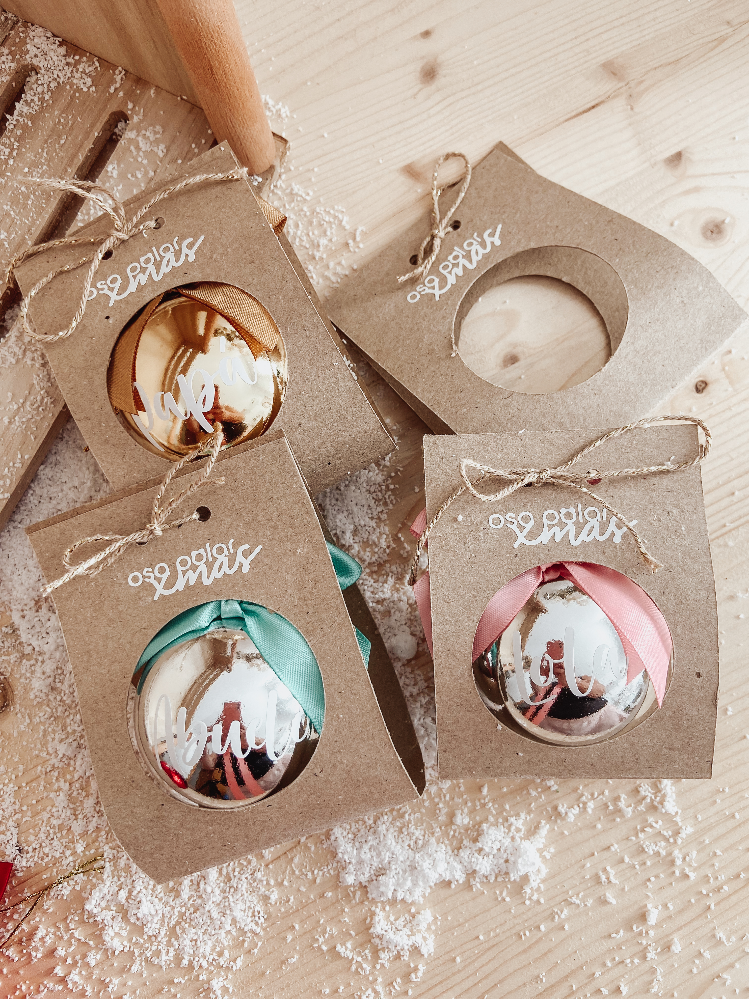 Nuestras bolitas grabadas a mano con un vinilo permanente y un lazo perfecto hará que tu árbol navideño cobre magia.
