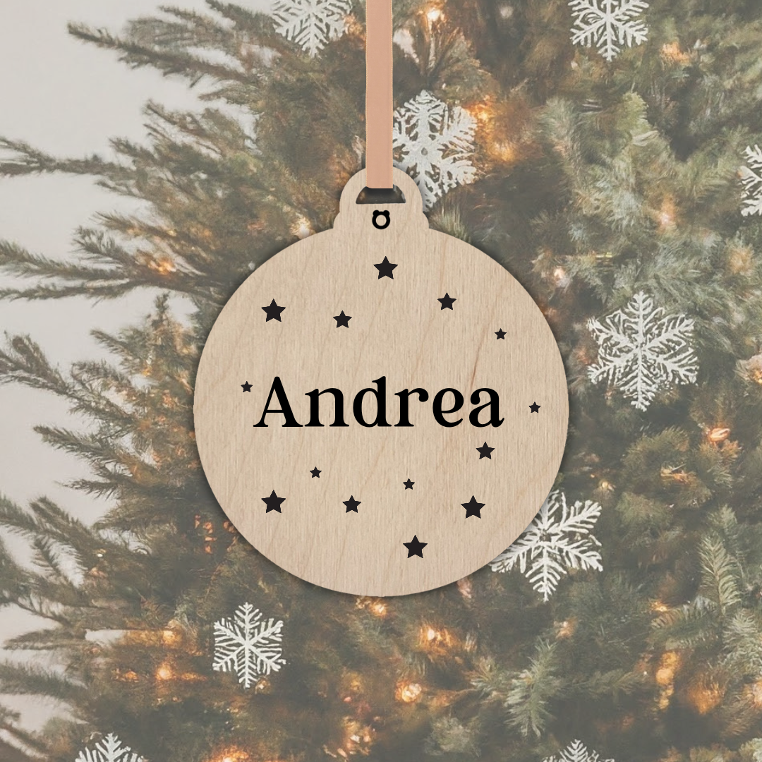 Bola grabada en madera natural.