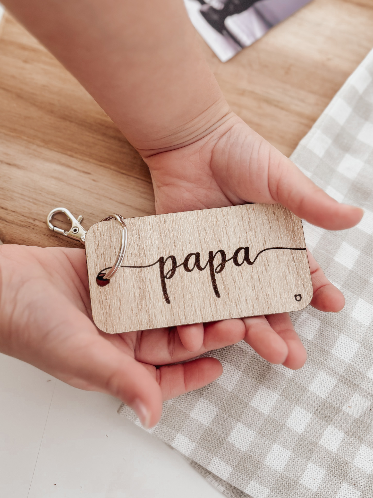 Este llavero de madera de alta calidad es la opción perfecta. Con un diseño elegante y minimalista, la palabra “papá” está grabada a láser con precisión en la madera,