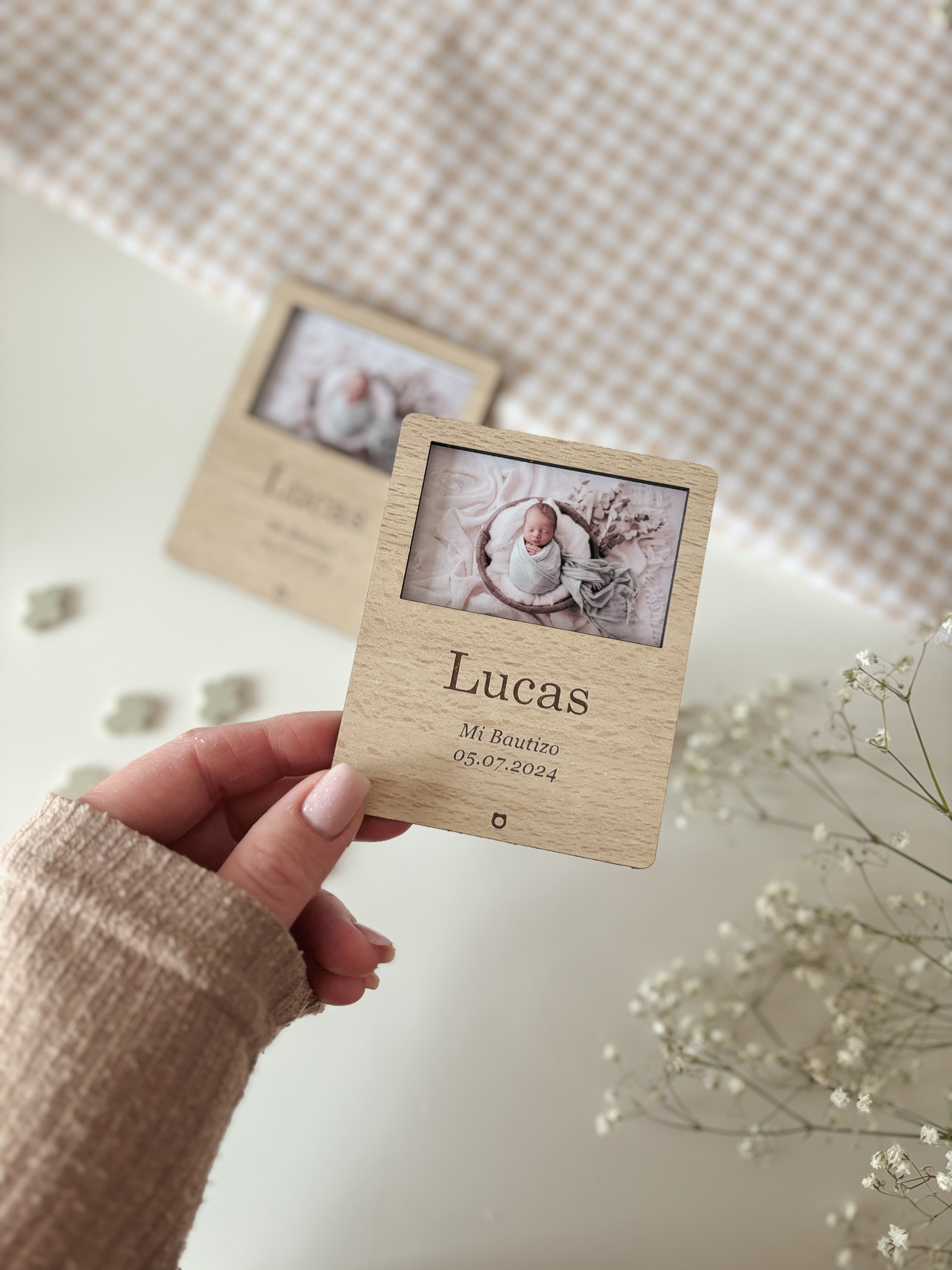 Este portafotos incluye imanes, una personalización láser y una foto opcional.