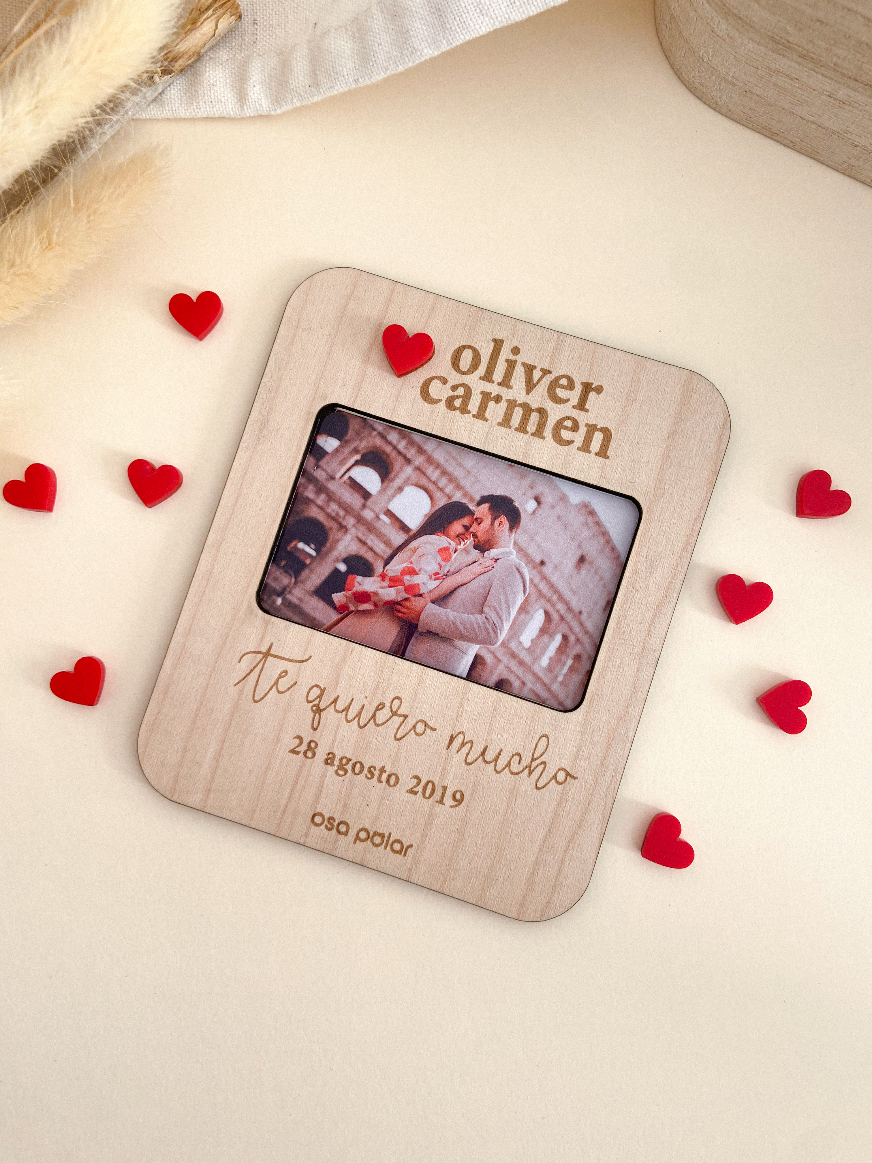 Este portafotos de maderita lo tiene todo: Una foto vuestra, un corazón sobresalido en metacrilato, vuestros nombres, vuestra fecha y un te quiero.